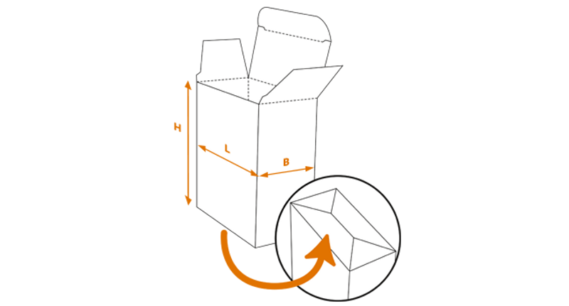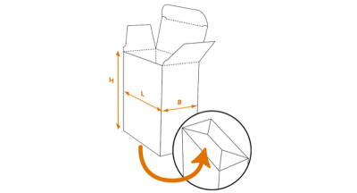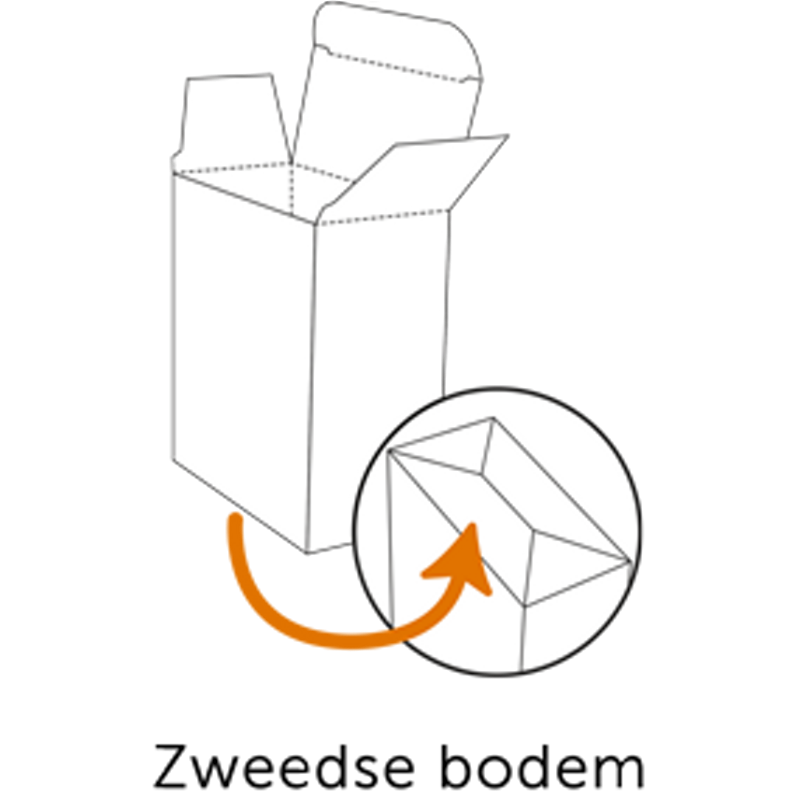 Doos met een Zweedse bodem. Eenvoudig om snel op te zetten en met een sterke bodem. Wordt handmatig gesloten zonder tape te gebruiken. Geschikt voor wat zwaardere vulling. Als de doos is opgezet is de doos alleen aan de bovenzijde met de insteekklep te openen.